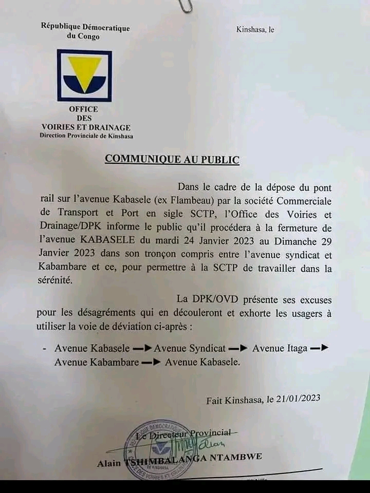 in A La Une, Actualités, La vie à Kin Kinshasa : l’OVD procède ce mardi à la fermeture d’une partie de l’avenue Kabasele par ENN 24 janvier 2023, 11h25 1.8k Vues 0share Facebook Twitter Pinterest LinkedIn 0share Facebook Twitter Pinterest LinkedIn See more Article précédent Kinshasa : démolition ce mercredi des constructions anarchiques le long de la rivière Funa Prochain article RDC : l’avion de chasse congolais visé par un missile rwandais What do you think? 0 points Upvote Downvote Browse and manage your votes from your Member Profile Page Edité par Elie Ngandu est un journaliste congolais travaillant depuis plus de trois ans pour le média en ligne lisapo.info à Kinshasa. Comments Our site Facebook Laisser un commentaire Annuler la réponseVotre adresse e-mail ne sera pas publiée. Les champs obligatoires sont indiqués avec *Commentaire * Nom * E-mail * Site web Enregistrer mon nom, mon e-mail et mon site dans le navigateur pour mon prochain commentaire. By using this form you agree with the storage and handling of your data by this website. * Loading… 0