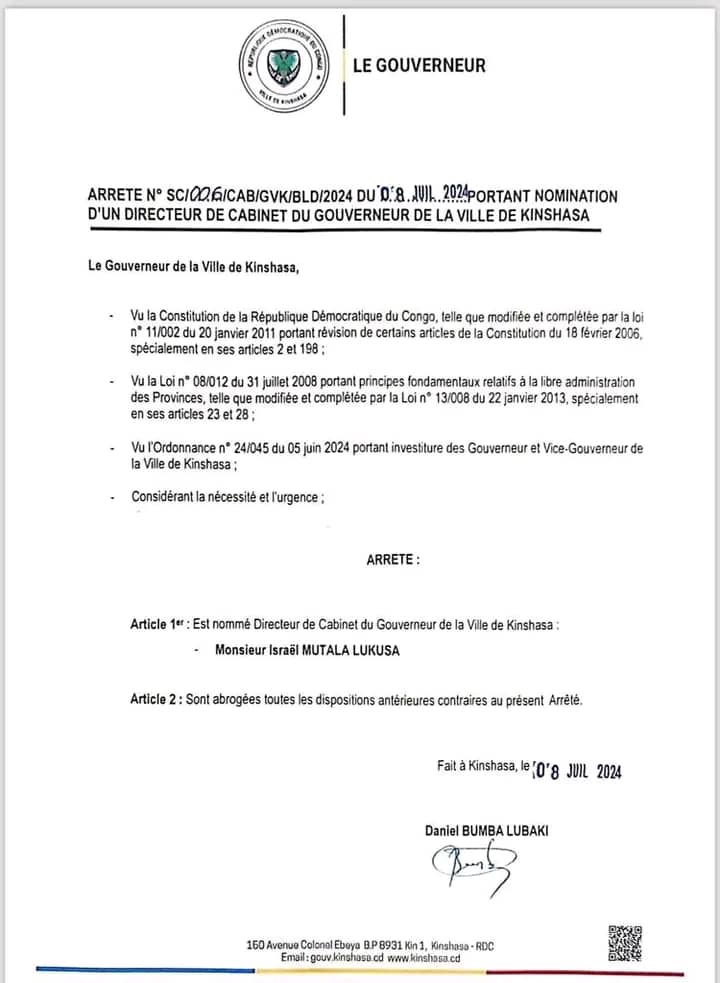 L’arrêté portant sa nomination a été signé le lundi 8 juillet 2024 par le gouverneur Daniel Bumba. Israël Mutala était jusqu’ici directeur général de 7SUR7.CD et Président de l’Association des médias en ligne en République démocratique du Congo.