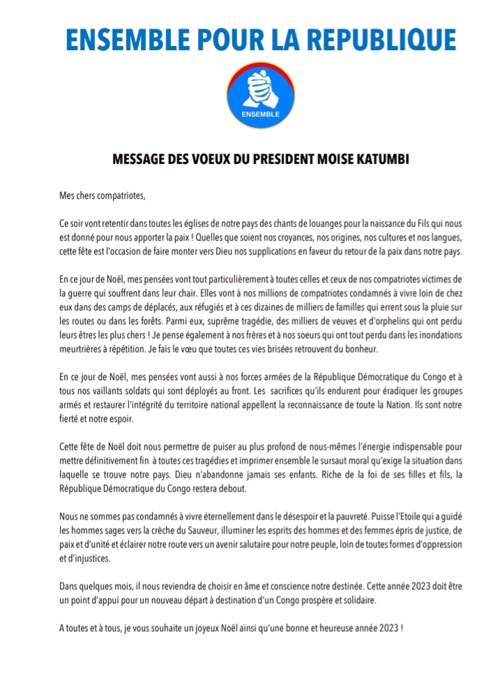 Le Président de Ensemble pour la République Moïse Katumbi Tchapwe a, dans un message des vœux de Noël et nouvel An publié le 24 décembre 2022, rendu un hommage vibrant aux Forces Armées de la RDC qui défendent l’intégrité territoriale au front, et aussi aux victimes des guerres de l’est ainsi que des inondations à Kinshasa.