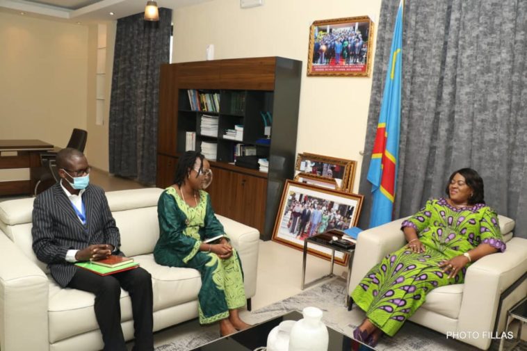 La Ministre d’Etat, Ministre de la Justice et Garde des Sceaux, Rose Mutombo a échangé, mercredi 12 mai 2021 avec la Directrice Adjointe d’Internews Noëmie Kilembe accompagnée du Juriste Senior d’Internews en charge des médias, Me Paul Nkuadio .