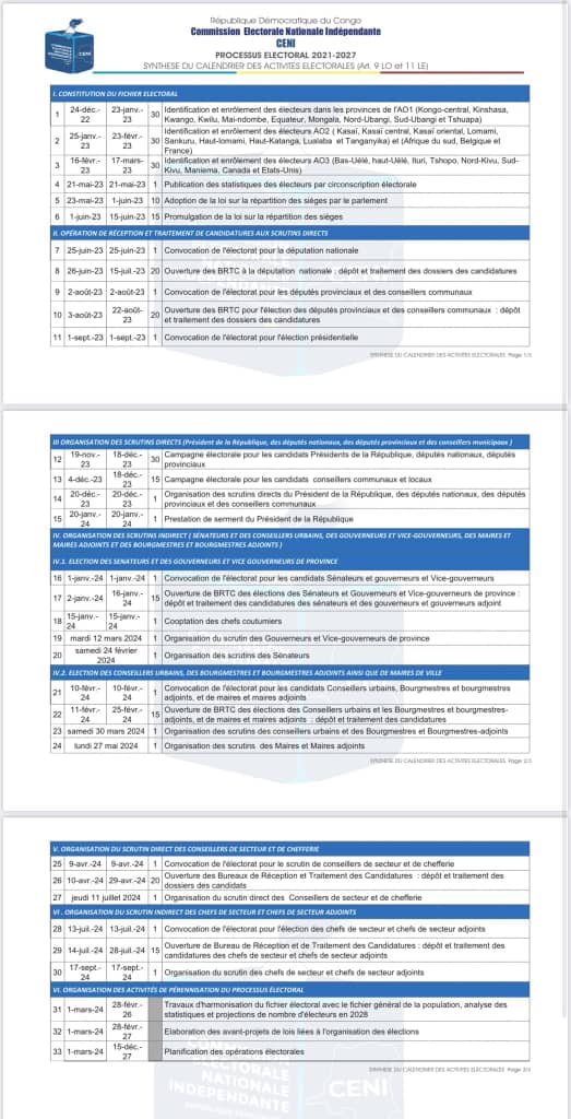 Le Président de la Commission Électorale Nationale Indépendante, Denis Kadima Kazadi vient de rendre public le calendrier électoral pour les élections de 2023 en République démocratique du Congo.
